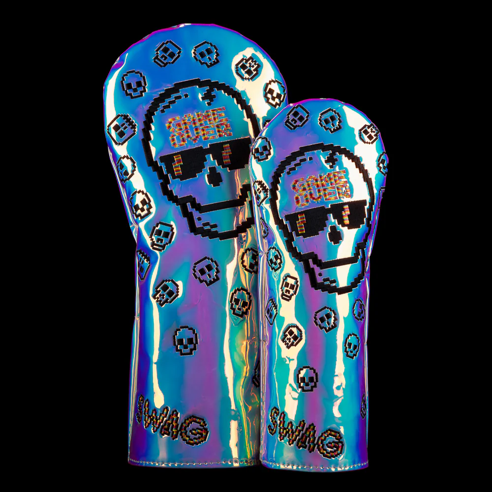 A pearlescent, color-shifting shell, rainbow-thread “GAME OVER,” and pixelated skulls give it that old-school screen-glow vibe. Both covers load in with matching art and bright pops that feel like leveling up your bag every time you pull a headcover.